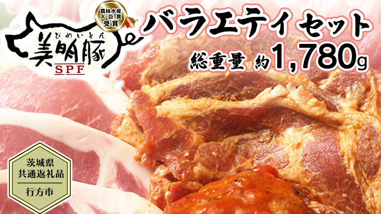 豚肉の常識革命!甘みのある脂身と最上級の肉質をご堪能ください! 【茨城県共通返礼品/行方市】 美明豚 バラエティーセット 約1,780g 豚肉 豚 SPF ブランド豚 詰め合わせ 食べ比べ セット 国産 モモ肉 もも バラ ハンバーグ 味噌漬け 切り身 切り落とし 贈答用 ロース バラ肉 肩ロース[CF001ya]