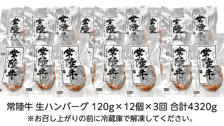 ★3ヶ月連続でお届け★ 【茨城県共通返礼品】【3ヶ月定期便】 黒毛和牛 常陸牛 100% 特製 プレミアム 生ハンバーグ 120g×12個入り 合計1,440g 八千代町産 白菜 使用 無添加 無着色 保存料不使用 冷凍 牛 牛肉 ビーフ 生 ハンバーグ こだわり [AU055ya]