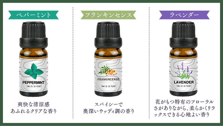 | 容量 | ・120ml(10ml×12本) (ペパーミント、フランキンセンス、ラベンダー、スイートオレンジ、レモングラス、ユーカリ、ローズ、ジャスミン、カモミール、サンダルウッド、ローズマリー、イランイラン 各10ml×1本) |