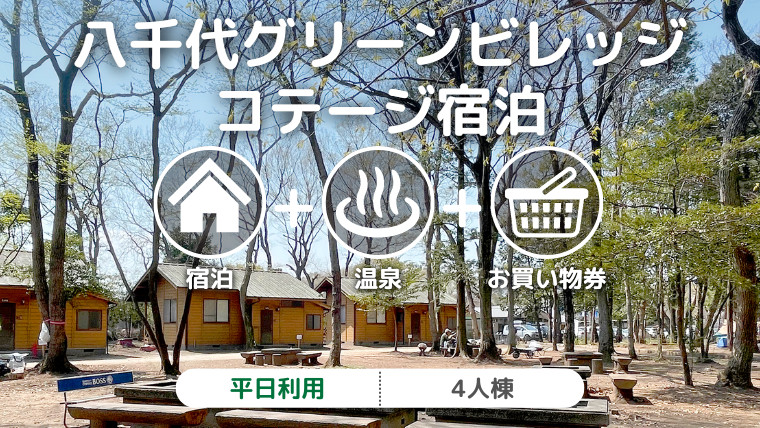 【ふるさと納税限定プラン】森のコテージ滞在と天然温泉で非日常の癒しを満喫しよう 八千代グリーンビレッジ コテージ 宿泊 平日利用 4人棟 【 平日宿泊 + 温泉入浴券 + お買物券 】セット 憩遊館 体験 限定 温泉 レジャー [AN007ya]