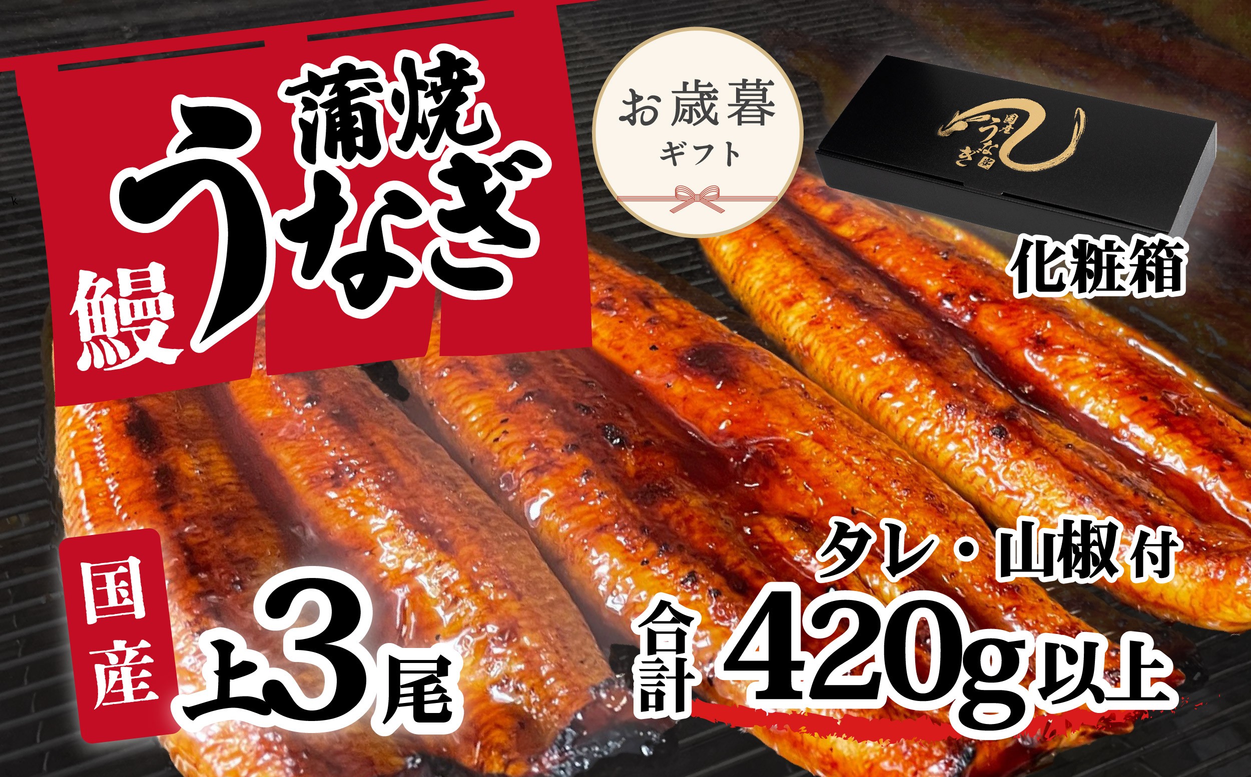 何といっても決め手は『味』 数量限定! 【 お歳暮熨斗つき 】【化粧箱入り】国産うなぎ 蒲焼き 3尾 セット ( 420g ) 大きさ の不揃い タレ・山椒付き ウナギ 鰻 ふぞろい 不揃い うな重 ひつまぶし 人気 茨城 八千代町 ふるさと納税 冷凍 お歳暮 歳暮 熨斗 ギフト プレゼント 化粧箱入り[SZRY]