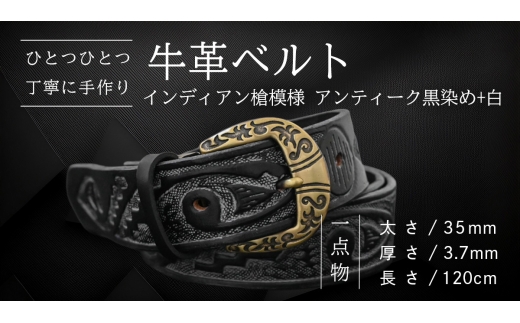 チョイス限定 革を育てる楽しみが味わえます! 【一点物】 牛革ベルト インディアン槍模様 アンティーク黒染め+白【太さ35mm / 厚さ3.7mm / 長さ(120cm)】 父の日 牛革 牛 革 皮 ベルト 手作り ハンドメイド [BE040ya-120]