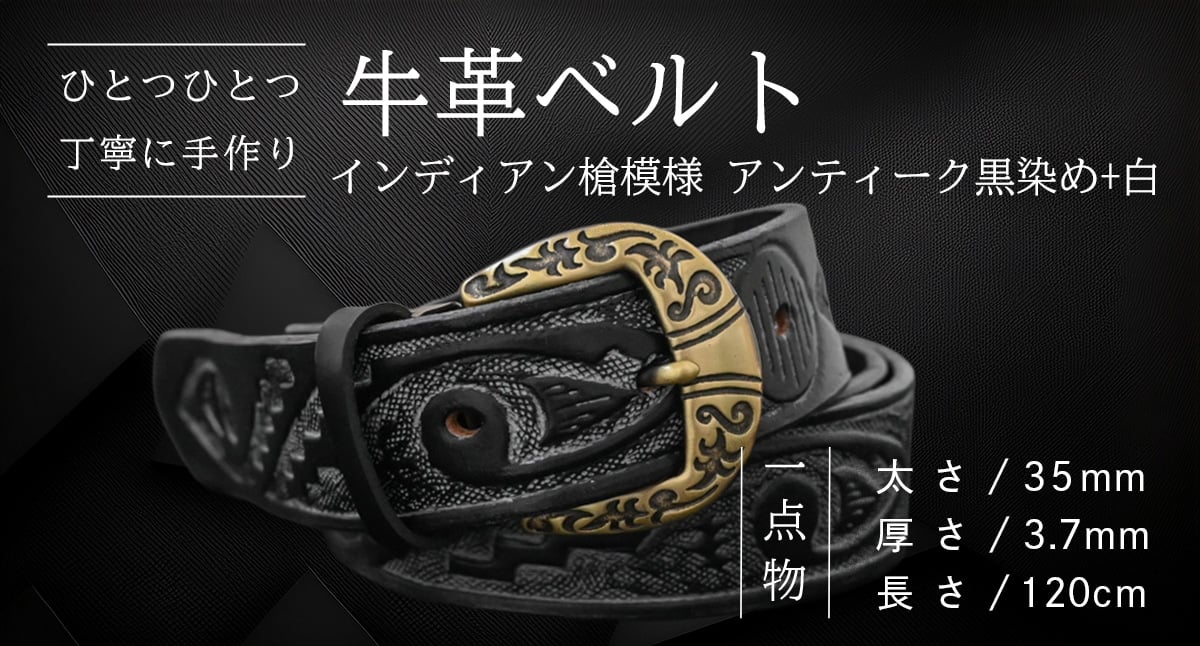 | 容量 | 【一点物】牛革ベルト(インディアン槍模様 アンティーク黒染め+白) 1本 太さ35mm / 厚さ3.7mm / 長さ(120cm) |