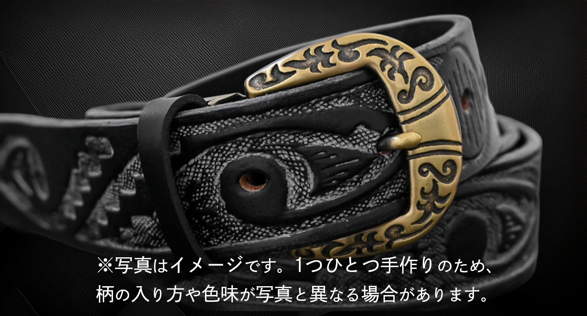 このベルトは、手作業で丸1日かけて柄を彫り、アンティーク調に黒染めにて仕上げたものです。図柄はインディアン槍模様です。