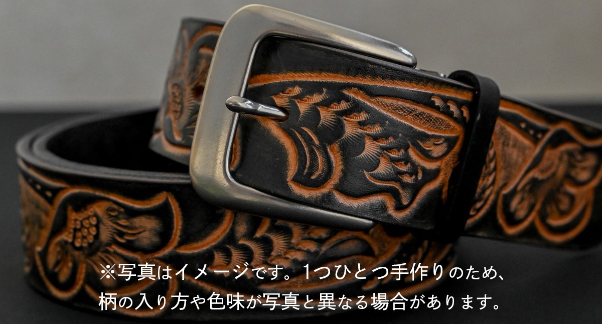 このベルトは、手作業で丸1日かけて柄を彫り、黒のかすれ染めにて仕上げたものです。