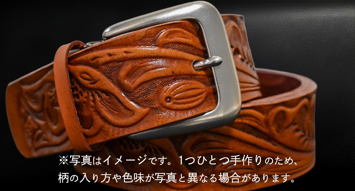 このベルトは、手作業で丸1日かけて柄を彫り、アンティーク調に茶染めにて仕上げたものです。