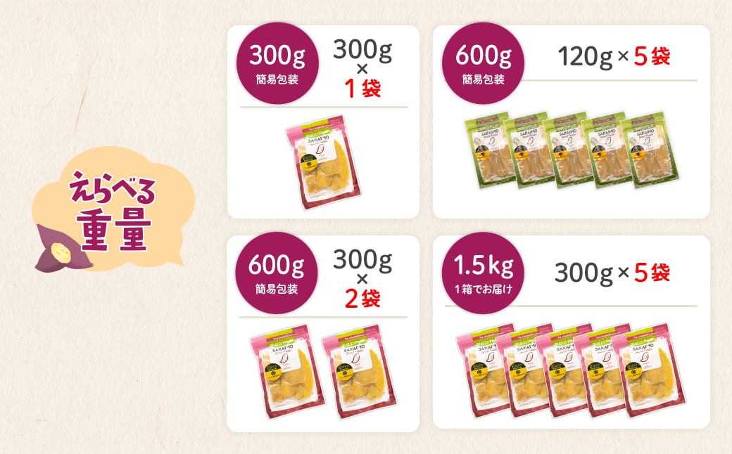 | 容量 | バリエーションより選択してください。 ■平干し芋 300g (300g×1袋) ■平干し芋 600g (300g×2袋) ■平干し芋 600g (120g×5袋) ■平干し芋 1.5kg (300g×5袋) ※クール便(冷蔵)でお届けいたします。 |