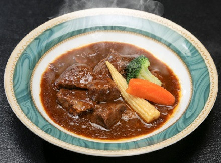 ビーフシチューは茨城県が誇る極上和⽜『常陸⽜』を元在フランス⼤使館公邸料理⼈の有川シェフ監修のソースでじっくり煮込み、箸でもきれる柔らかさに仕上げました。