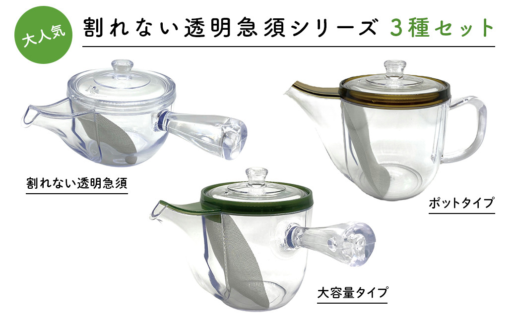 大人気割れない透明急須&大容量タイプ&割れないティーポットの気分やご利用人数に合わせて使い分けができるお得な3点セットになります。