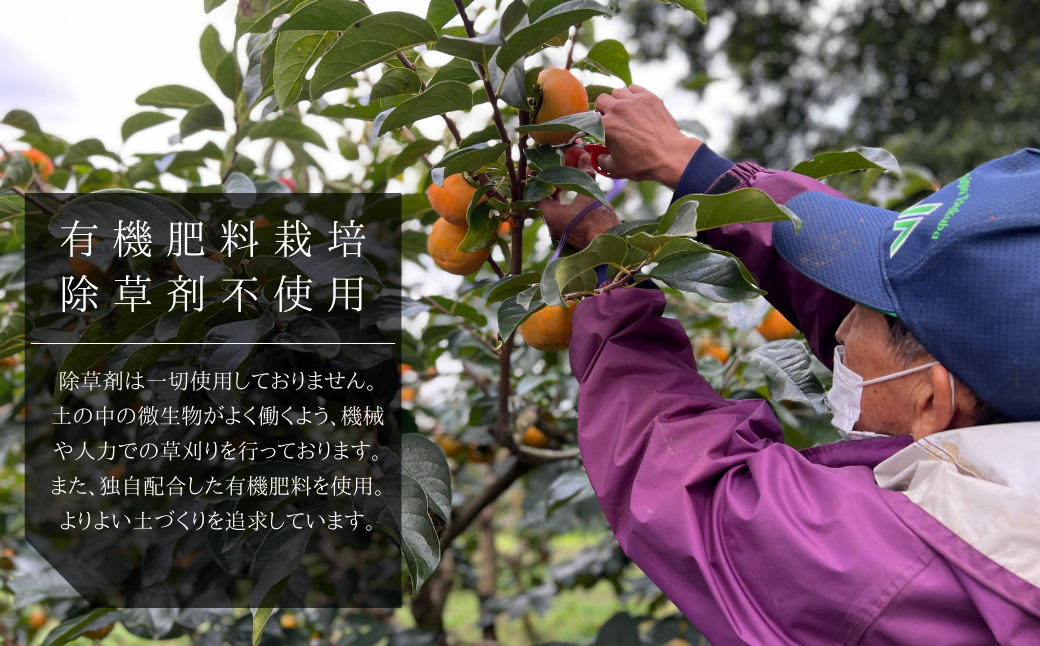 また、米ぬかや魚粉・発酵菌など独自配合した有機肥料を適宜使用し、農薬の使用を必要最低限に抑えた「安心・安全」な柿づくりをモットーにしています。