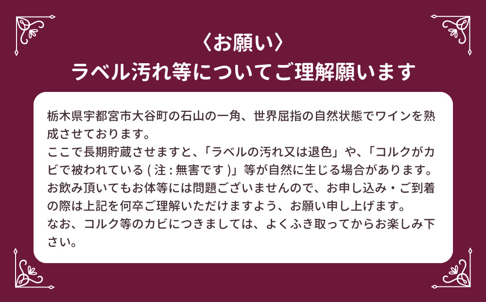 ここに長期貯蔵させますと、「ラベルの汚れ又は退色」や、「コルクがカビで被われている(注:無害です)」等が自然に生じる場合があります。