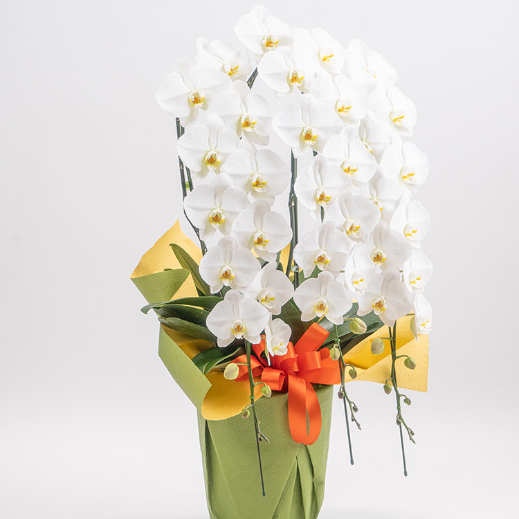 フラワーギフトの花形、大輪胡蝶蘭【白】3本仕立て。大きなお花が連なる姿は豪華絢爛、贈られる人を大切に思う、心が伝わる一品です。