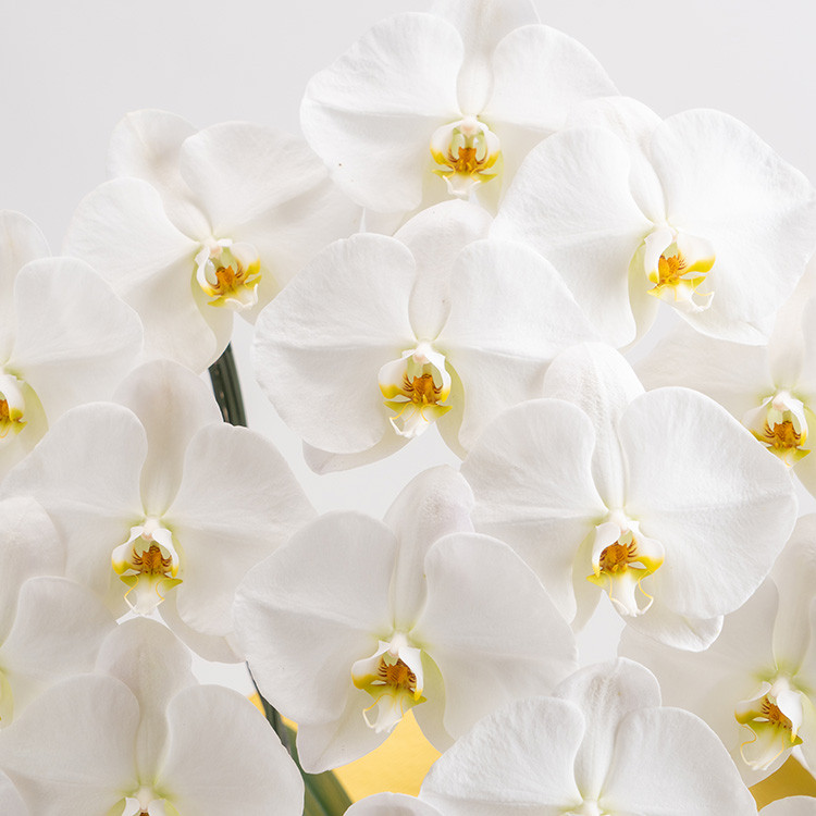 胡蝶蘭3本が1つの鉢に入っております。花輪の数は1本につき15輪以上、3本で45輪以上と大変豪華な胡蝶蘭です。花の大きさは、11~15cm前後の「大輪」と呼ばれる花輪のみで構成されており流れるように花輪が並び、一際目を引く美しいシルエットになっております。ビジネスのお祝いにも最適です。