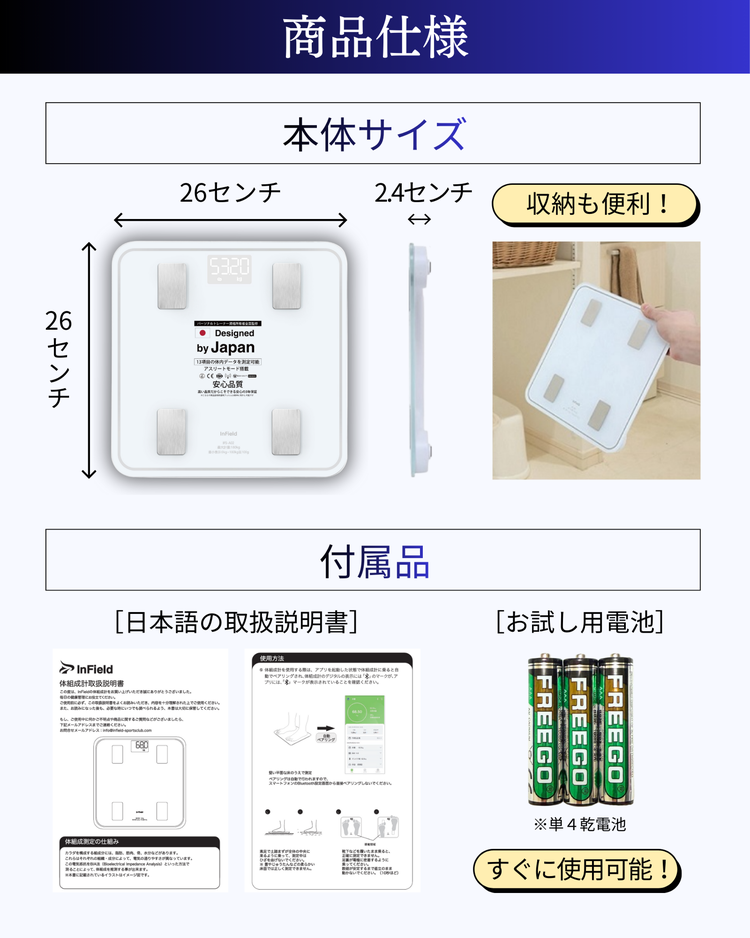 | 容量 | 本体、単4形乾電池(試用電池)、日本語版取扱説明書 |