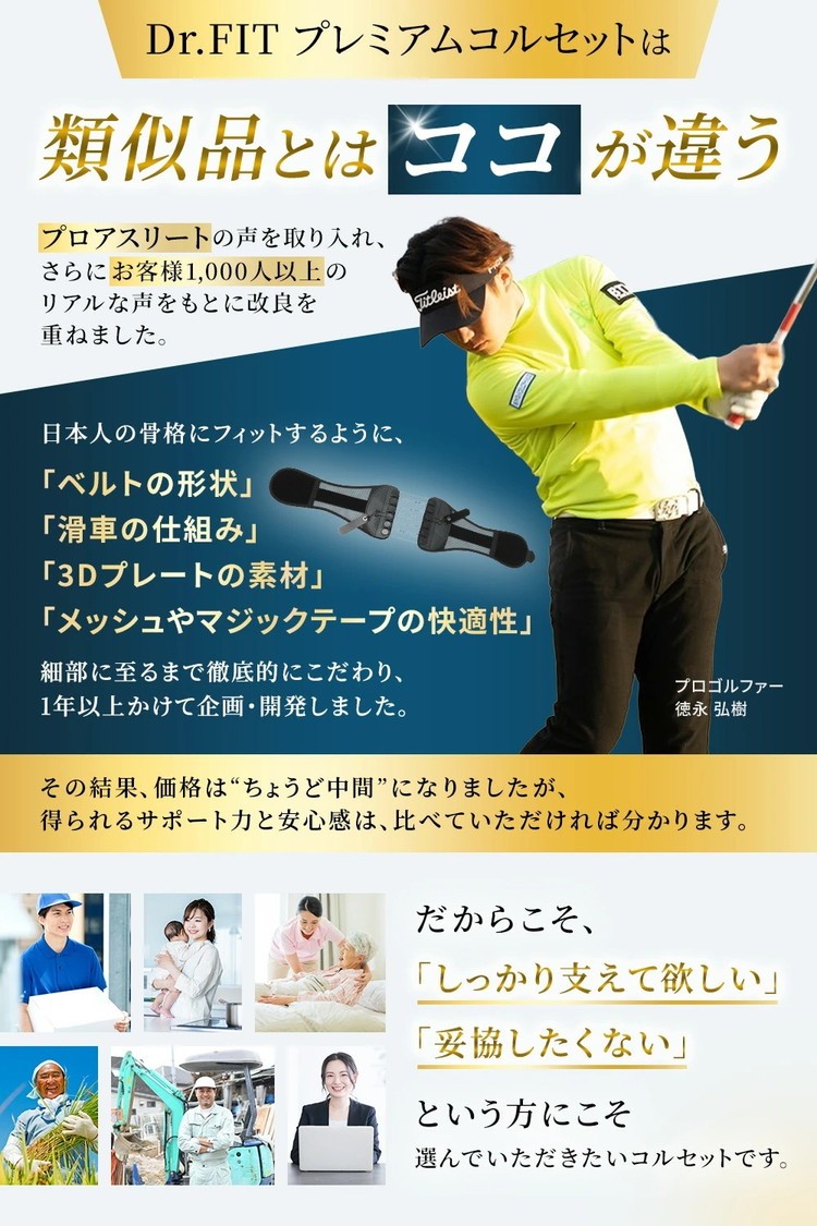 私達は最初に1番大切なお客様“1000人”のリアルな声を聞き、日本人のためにこのベルトを企画・開発しました。骨盤矯正・腰痛対策にこのベルトを使用することによって、骨盤を安定して下半身が正しい位置にキープされることによりしっかり姿勢をキープし、さまざまな腰の悩みを改善・予防に導くサポートをします。