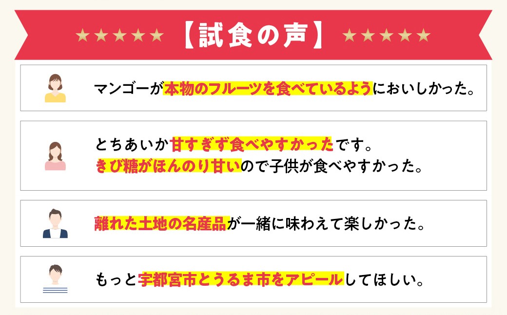 寄附者の皆様には、宇都宮の魅力を感じ、宇都宮をもっと好きになっていただけるよう、感謝の気持ちを込めて、餃子や宇都宮牛、宇都宮カクテル、とちおとめなどの宇都宮ならではの特産品をお送りしています。