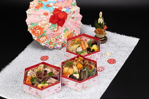 新年を彩る華やかな六角重に44品目もの食材を詰め込んだおせちです。