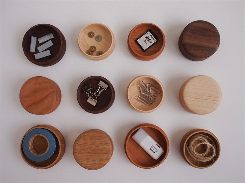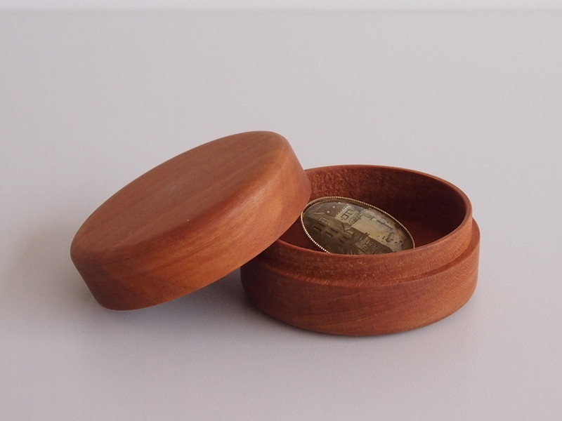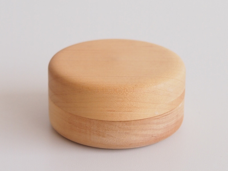 旋盤の「削る」技術を利用した小さな丸い箱。丸くかわいらしく、マカロンのかたちをしています。片手で蓋がはずせます。