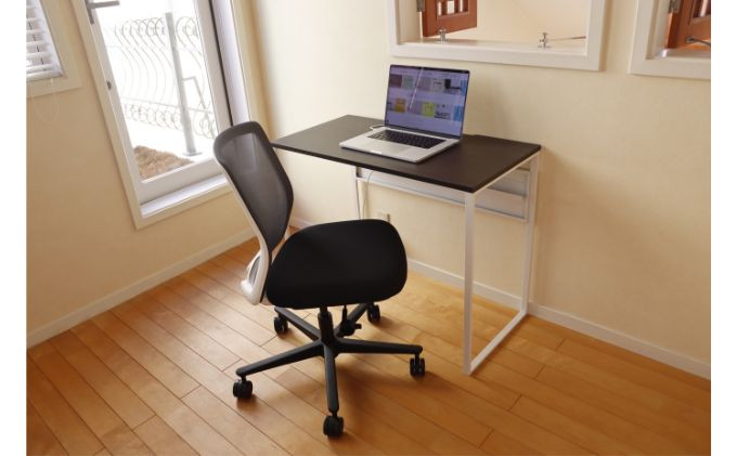 天板奥側にはスリットが入っており、ノートパソコンなどの電源ケーブルを美しく配線できます。スリットは幅35cm(写真手前側)、奥行1.5cmです。また、奥側の脚の間には揺れを抑えるための補強フレームが入っています。補強フレームの内側には奥行5cm(内寸)の配線スペースを設けており、電源タップなどを置くこともできます。