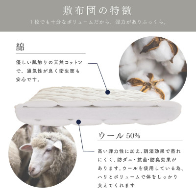 | 容量 | ■内容・サイズ/製造地 APHRODITA 日葵 ボリューム羊毛混敷布団140cm×210cm ダブルロング【1枚】 製造地:栃木県小山市 ■原材料 生地:綿100% 200本ブロード 中綿:羊毛混(ニュージーランド産ウール50%・帝人マイティ―トップ(R)2ECO50%)2.8kg 防ダニ・抗菌防臭機能 固綿:ポリエステル100% 4.2kg |
