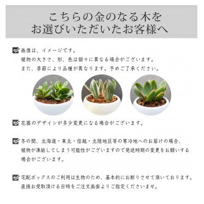 植物:金の生る木陶器鉢植え、セット品:陶器鉢皿、育て方のしおり