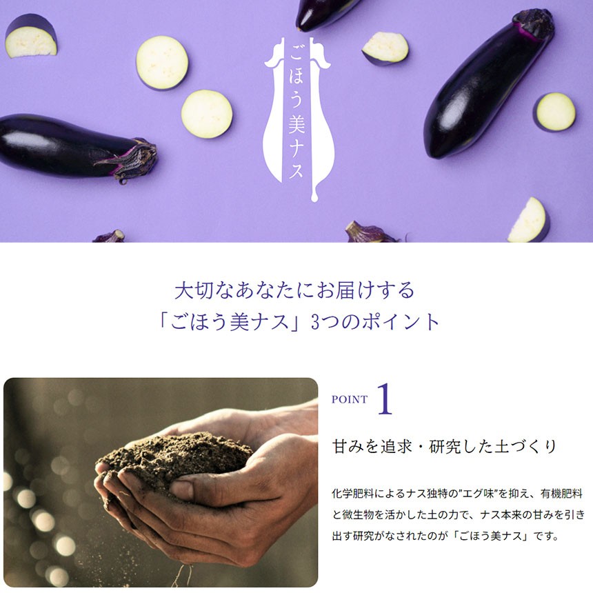 ハーティッチファームのオリジナルブランド「ごほう美ナス」は、“普段の食卓に ちょっとだけ「ご褒美」を”をコンセプトにつくられました。