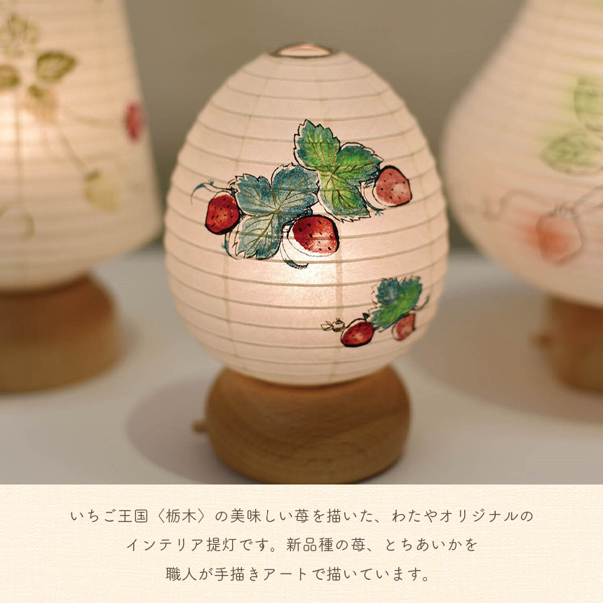 ひとつひとつ丁寧に手描き絵付けにて仕立てた、可愛らしい苺のインテリア提灯です。