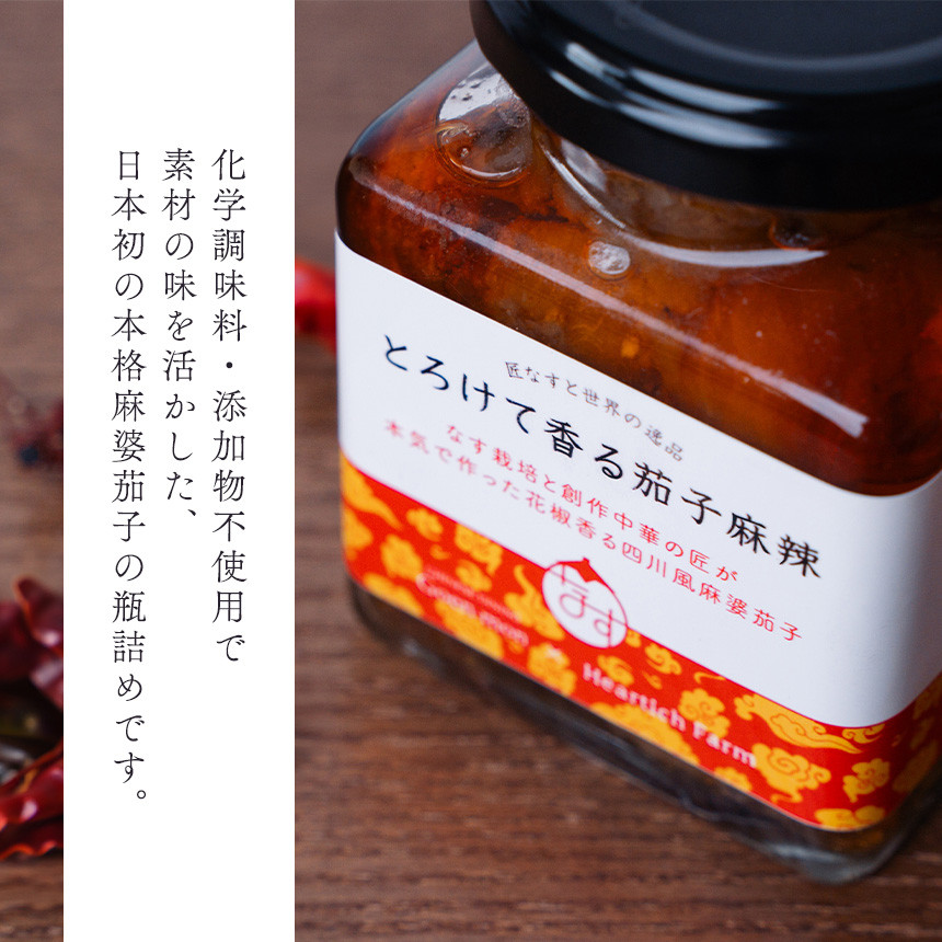ナス栽培のプロのHeartich Farmと創作中華のプロGoenmonさんのコラボで作った、日本初の麻婆茄子の瓶詰です。