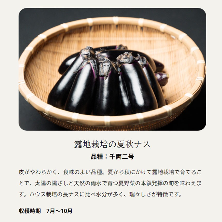 7月から10月には露地栽培の「夏秋ナス(品種:千両2号)」、11月から翌6月はハウス栽培の「長ナス(品種:PC筑陽)」でお届けいたします