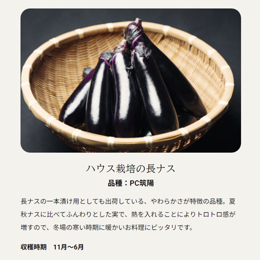 7月から10月には露地栽培の「夏秋ナス(品種:千両2号)」、11月から翌6月はハウス栽培の「長ナス(品種:PC筑陽)」でお届けいたします。