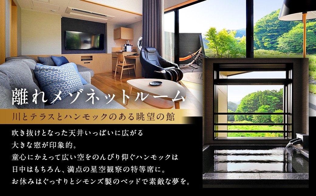 塩原温泉に唯一の全室露天ぶろ付きの離れの宿として2017年オープン。 2021年4月にはロビー棟、温浴棟、離れメゾネットが新設され益々充実の施設として生まれ変わりました。 今回は新設された当館最高ランクの離れメゾネットルームをご用意しました。 お食事は別館「和 創作Dining百花」にて山海創作料理を個室にてお楽しみ頂けます。 ◇無料のサービスもご用意しました。 ・客室の冷蔵庫内のドリンク無料利用 ・ロビー棟にて、スパークリングワイン無料提供(チェックイン~17:30まで) ・ロビー棟にて、生ビールサーバー無料提供(チェックイン~17:30まで、21:00~22:30まで) ・ロビー棟にて、エスプレッソマシーン無料提供(チェックイン~チェックアウトまで) ・ロビー棟にて、セルフバー(日本酒、焼酎、リキュール、梅酒など)無料提供(21:00~22:30まで) ・選べる色浴衣(女性限定) ◇2021年新設の眺望自慢のお部屋 離れメゾネットルーム(71平米) 1階:和室+リビングルーム+川テラス(ハンモック付き) 2階:ベッドルーム+半露天風呂 自然と温泉、創作料理に満たされる全10室の離れ宿で思い出に残る1日をお過ごし下さい。 【温泉】 源泉名:畑カッパ源泉・金録源泉 混合泉 泉質:アルカリ性単純泉(PH7.5) 【お申込みの流れ】 ・寄附お申込み後、離れの宿 楓音よりペア宿泊券とパンフレットをご送付いたします。 ・ご予約はお電話にて承ります。ご予約の際に当利用券を利用する旨、お伝えください。 【使用期限】 発行日より1年 【サービス提供地】 栃木県那須塩原市 【 温泉 宿泊券 チケット 旅行 家族 トラベル 宿泊】 【地場産品基準】 7号 市内に所在する宿泊施設の利用券のため