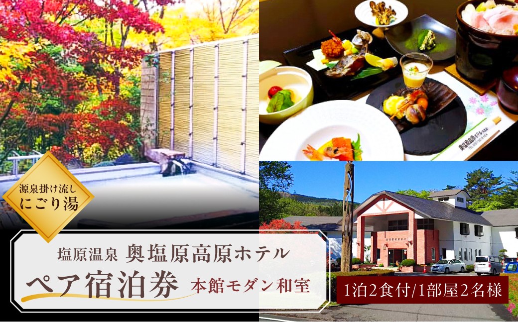 塩原温泉 源泉掛け流しにごり湯 奥塩原高原ホテル ペア宿泊券 本館モダン和室(1泊2食付) ns016-001【温泉 宿泊券 チケット 旅行】