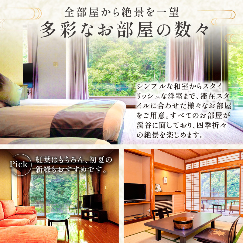 塩原随一の景観、全てのお部屋から、 四季折々の絶景がお愉しみいただけます。季節と共に移り変わる景観を楽しみながら、ほっこりとひと時をお過ごし下さい。