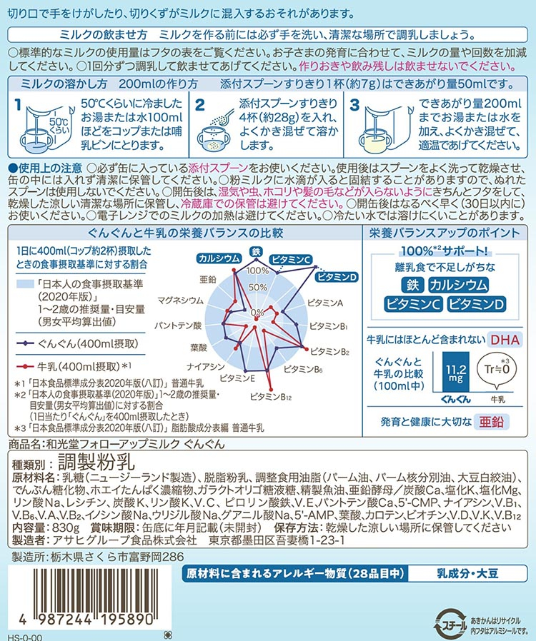 牛乳や食事では不足しがちな栄養をおいしくサポート 「和光堂フォローアップミルク ぐんぐん」 満9か月頃から3歳頃まで ベビーミルク 鉄・カルシウム・DHA配合 830g×4缶 | 離乳食 赤ちゃん 栄養サポート