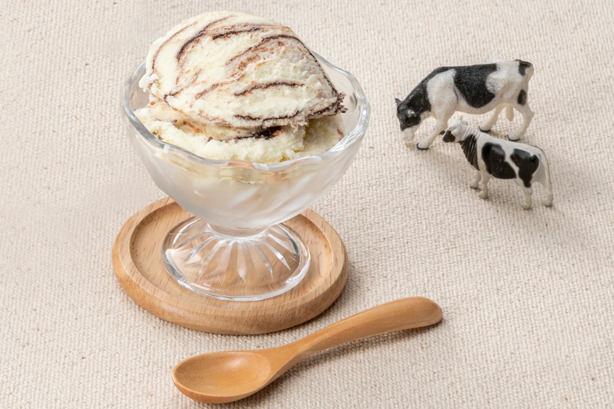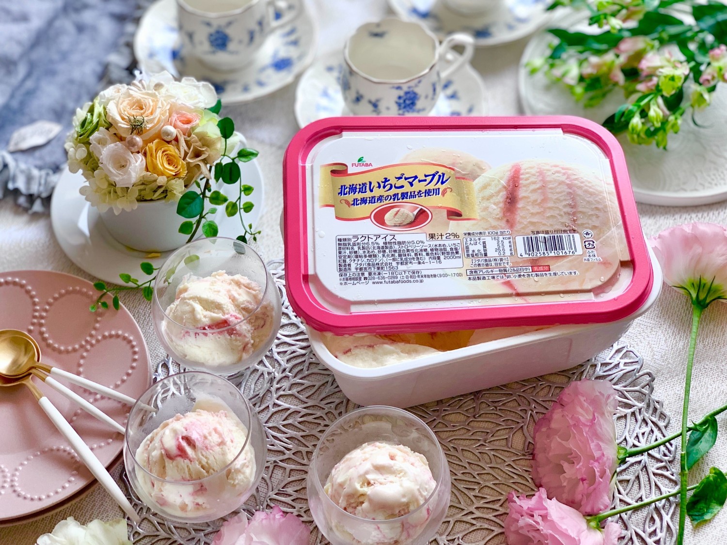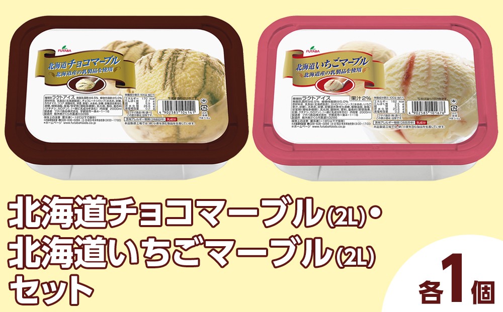 バニラアイスにチョコソースをマーブル状に混ぜ込んだ「北海道チョコマーブル」、バニラアイスにいちごソースをマーブル状に混ぜ込んだ「北海道いちごマーブル」のホームアイス2種セットです。