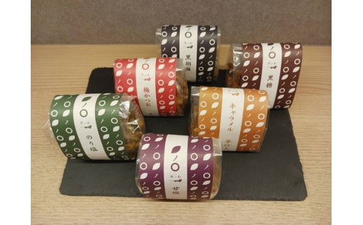 容量 | 甘塩・キャラメル・黒糖・黒胡麻・梅かつお・のり塩(70g×6個) |
