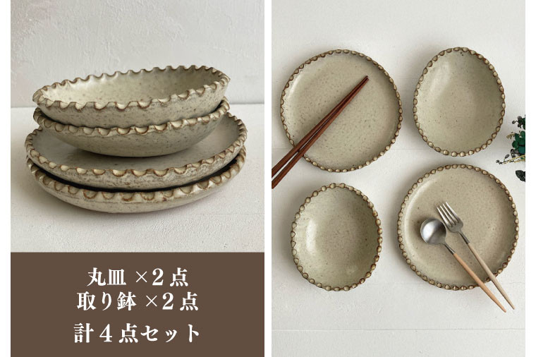 | 容量 | 丸皿×2点 取り鉢×2点 計4点セット 丸皿 サイズ:直径約18cm 重さ:約360g 取り鉢 サイズ:縦約16cm 横約13.5cm 深さ約4cm 重さ:約250g ※縦横ともに最大幅箇所となります。 ※手づくり品の為サイズは5mm前後、重さは50g前後の誤差はご容赦願います。 |