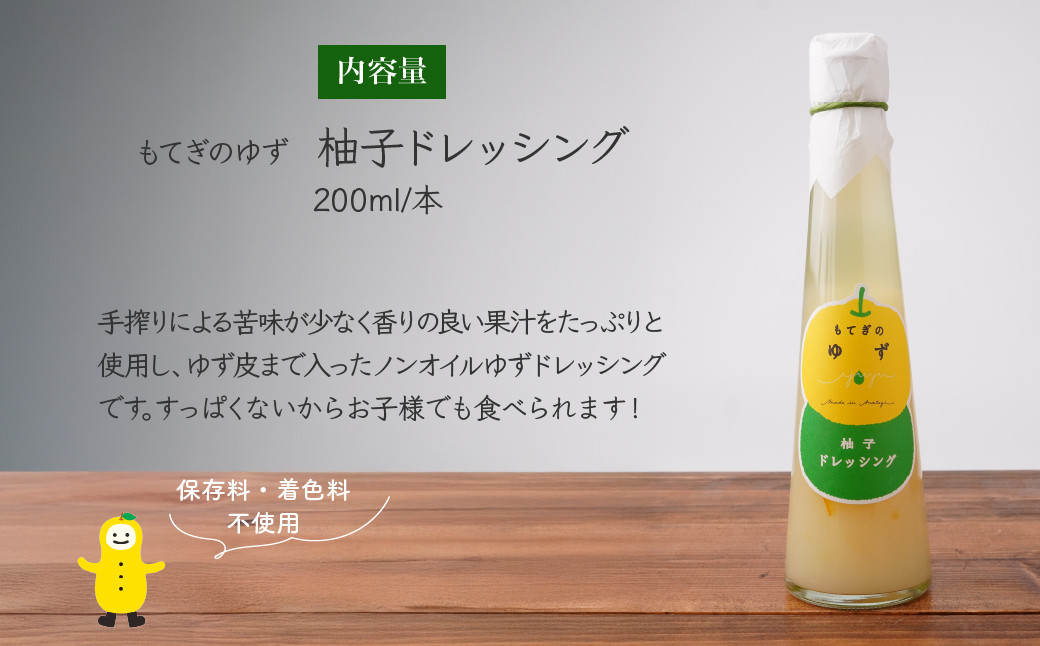 茂木産ゆずの手搾り果汁をたっぷり使用した、香り高いドレッシングです。 茂木産ゆずを使用! ドレッシング 200ml×4本 保存料・着色料・香料不使用 | ゆず 柚子 果汁 ドレッシング 調味料 無着色 保存料 不使用 サラダ 野菜 ノンオイル ヘルシー マリネ カルパッチョ もてぎプラザ 栃木県 茂木町