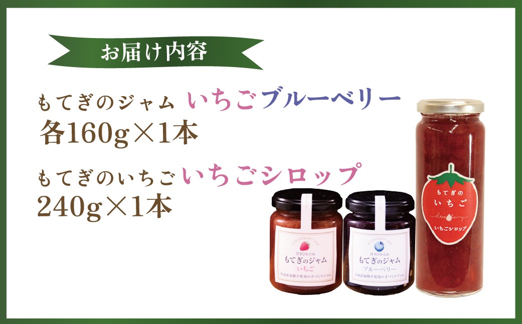 茂木産のいちご、ブルーベリーをそれぞれ使用したジャムに苺シロップを加えたセットです。素材を活かした味わいが特徴、果実のおいしさを楽しんで下さい。合成保存料・合成着色料は使用しておりません。