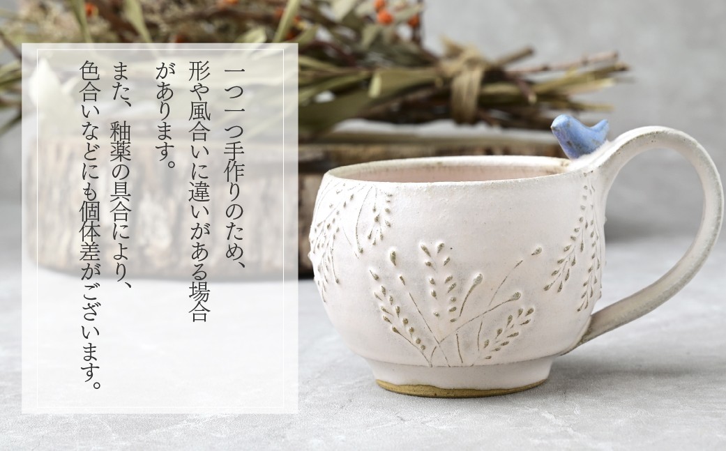 小鳥のマグカップ ホワイト ■注意事項 ・画像はイメージです。ひとつひとつ手作りのため、サイズや色、柄に違いが生じる場合がございます。予めご了承ください。 ・在庫がない場合は、陶芸家が製作してからの出荷となりますので、3ケ月程度かかる場合もございます。予めご了承ください。 【地場産品に該当する理由】 3号 製品の主要な製造・加工を市内で行っており、相応の付加価値が生じているものであるため