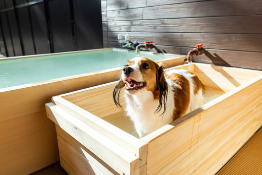 四季の宿こよみはペットと泊まれる完全独立型の一棟貸スタイルのホテルです。全棟にはプライベートドッグランが完備され、お風呂は源泉かけ流しの硫黄泉でご滞在中いつでも入浴ができます。又、愛犬用の浴槽もご用意しておりますので、お風呂も一緒にお楽しみいただけます。