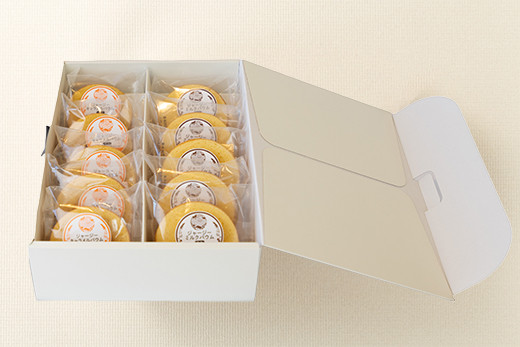 鶏卵(国産)、小麦粉、砂糖、ショートニング、マーガリン、牛乳、コーンスターチ、水あめ混合異性化液糖、キャラメル、脱脂粉乳、乳化剤、膨張剤、香料、着色料(カロテン)