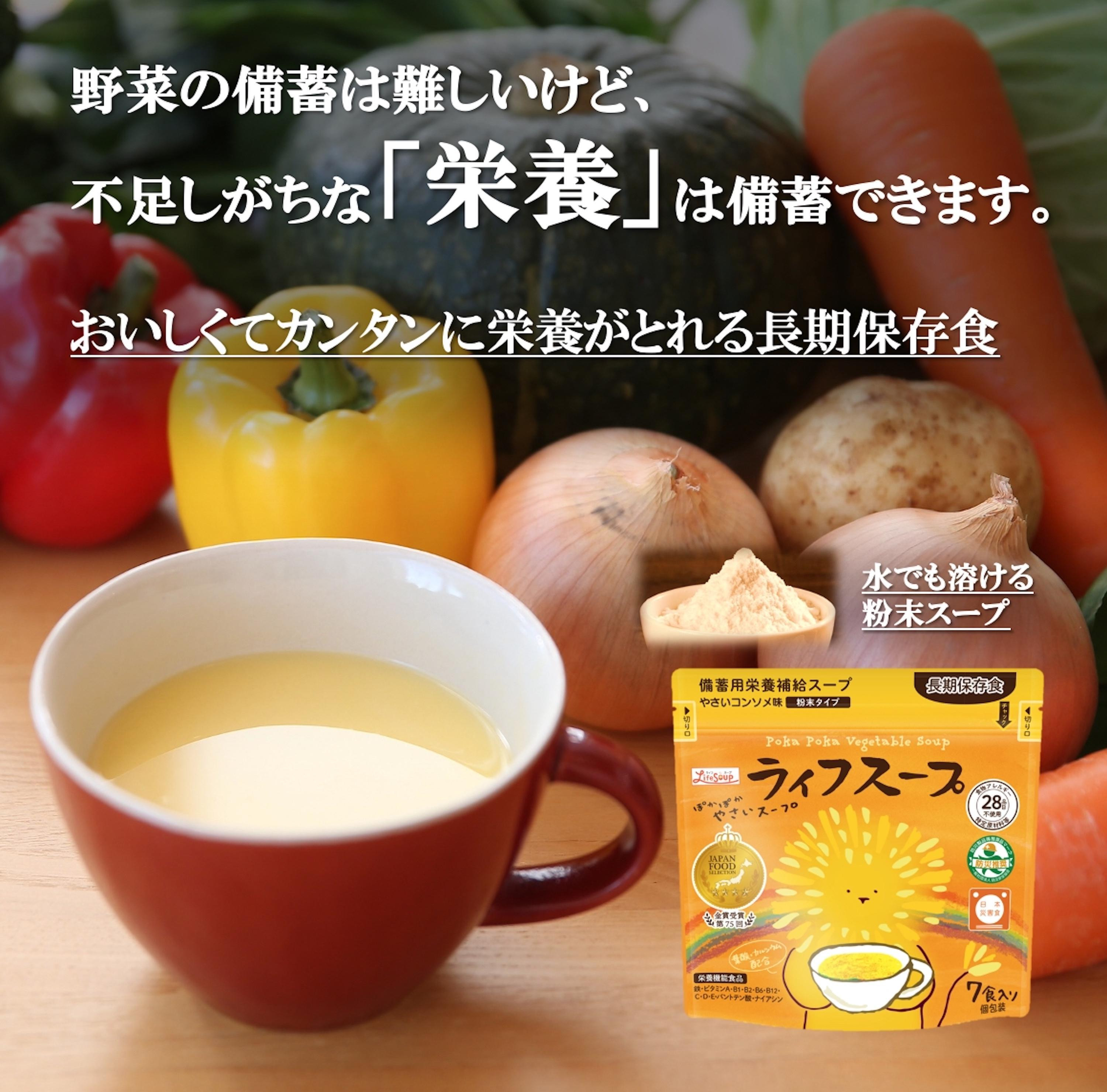 ライフスープは被災時の健康維持に必要なビタミン11種とミネラル2種の栄養強化し、健康維持を目的とした、5年間保存可能な粉末スープタイプの栄養補助食品です。