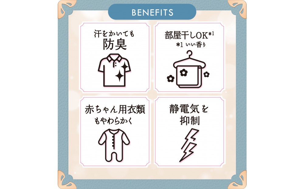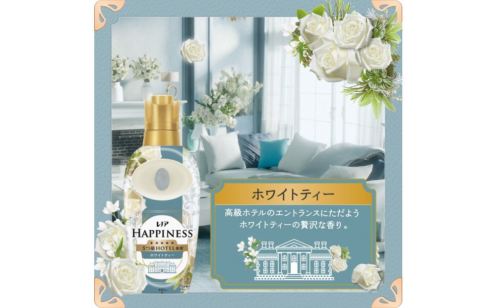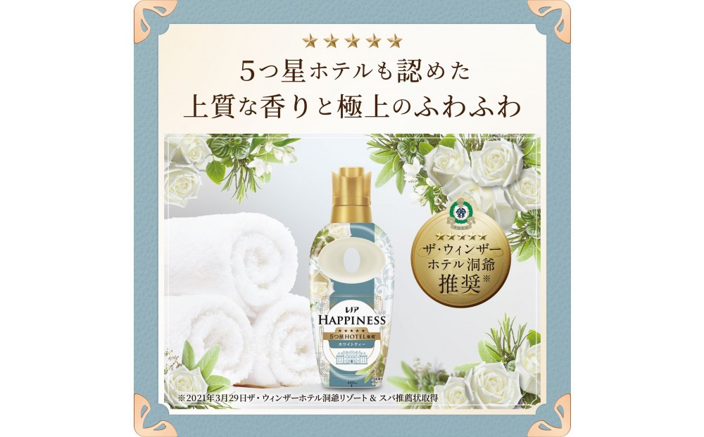 ホワイトティーの香り。高級ホテルのエントランスにただようホワイトティーの贅沢な香り。 5つ星ホテル推奨*。高級ホテルタオルのような、ふわふわシフォンにヨレ・毛玉も防ぐ*1汗をかいても防臭部屋干しOK*2赤ちゃん用衣類もやわらかく静電気を抑制 約4ヶ月分^1。65mL増やした新サイズ^2!*詳しくはウェブへ。
