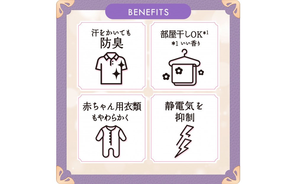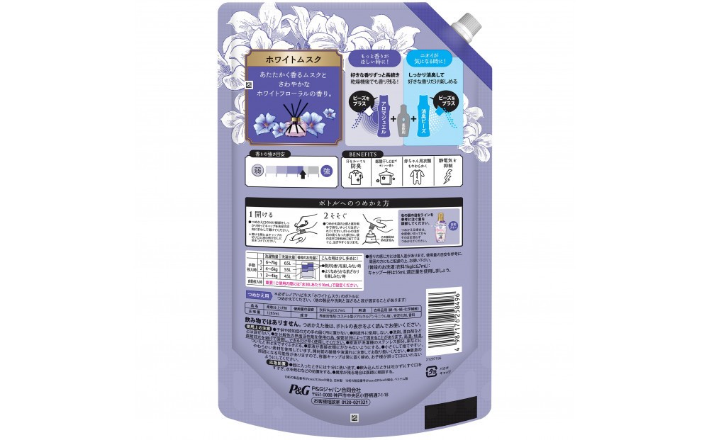 ホワイトムスクの香り。あたたかく香るムスクとさわやかなホワイトフローラルの香り。 5つ星ホテル推奨*。高級ホテルタオルのような、ふわふわシフォンにヨレ・毛玉も防ぐ*1汗をかいても防臭部屋干しOK*2赤ちゃん用衣類もやわらかく静電気を抑制 約4ヶ月分^1。65mL増やした新サイズ^2!*詳しくはウェブへ。