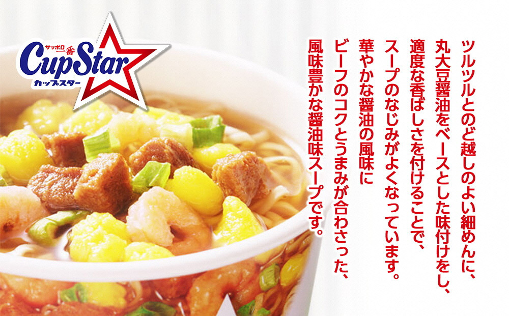 サッポロ一番 カップスター 醤油ラーメン×12食|ラーメン らー…10,000 円 ポークダイスの香ばしい風味と華やかな醤油の風味が特徴的なカップスター醤油味です。 ツルツルとのど越しのよい細めんに、丸大豆醤油をベースとした味付けをし、適度な香ばしさを付けることで、スープのなじみがよくなっています。 華やかな醤油の風味にビーフのコクとうまみが合わさった、風味豊かな醤油味スープです。 ポークダイス、スクランブルエッグ、えび、ねぎの組み合わせです。 是非ご賞味ください!! 【地場産品に該当する理由】 3号 製品の主要な製造・加工を市内で行っており、相応の付加価値が生じているものであるため - 常温便
