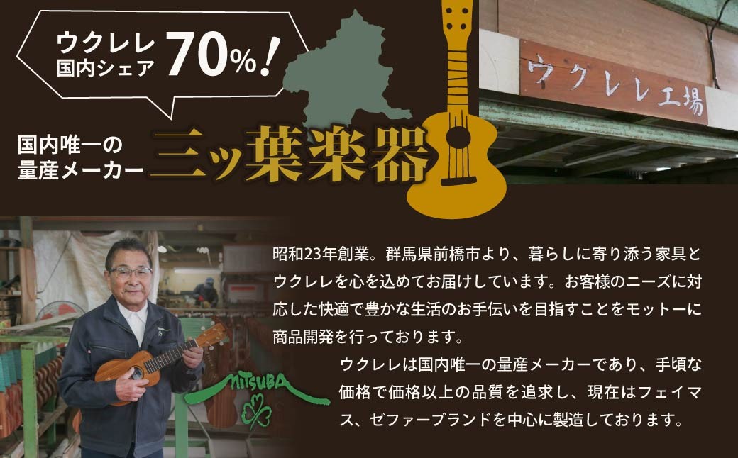 ウクレレ業界のシェア70%の三ツ葉楽器が手掛けるオリジナルブランドとして1999年に登場したゼファー。確かな技術で生まれたウクレレは初心者からプロに至るまで幅広く愛されています。