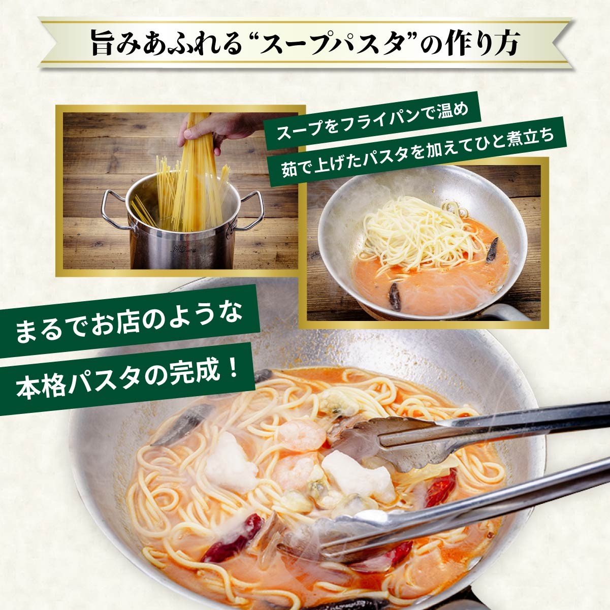 スープをフライパンで温め、茹で上げたパスタを加えてひと煮立ちさせるだけで、まるでお店で食べるような本格パスタが完成します。