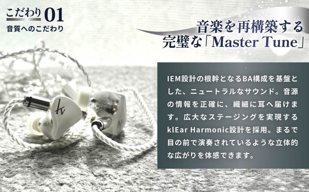 IEM設計の根幹となるBA(Balanced Armature)構成を基盤とし、ニュートラルなサウンドと広大なステージングを実現する klEar Harmonic設計 を採用しています。