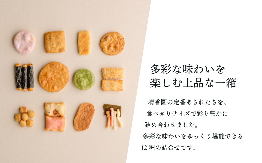 清香園の定番あられたちを、食べきりサイズで彩り豊かに詰め合わせました。